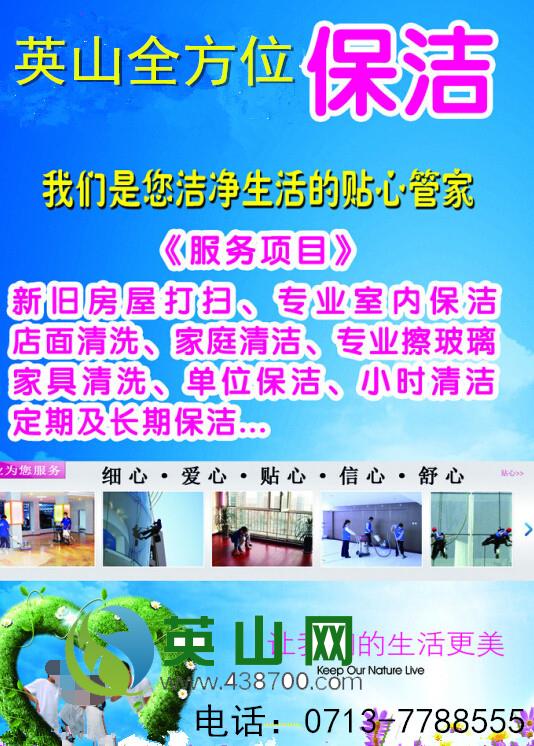 家居保洁,家庭搬迁、管道疏通、家电维修: 英山县全方位服务有限公司家政服务,包括:月嫂、保姆、保洁、护理、小时工、市政环卫工程、居家保洁、家庭搬迁、家电维修、管道疏通、外墙清洗服务等。我公司是综合型家政服务企业,为客户提供诚信、便捷、有保障、高品质的家政服务。